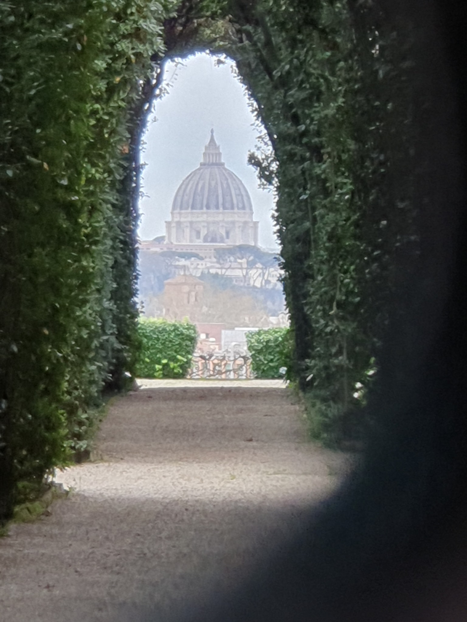 En underlig og fin opplevelse er, når vi kikker gjennom nøkkelhullet på Priorato di Malta, i porten til tempelriddernes hage og kirke, hvor det åpenbarer seg et vakkert skue over mot Vatikanet. Du ser Peterskirken langt i det fjerne, perfekt rammet inn av tempelriddernes etter hvert svært så berømte nøkkelhull. Kirken og haven på innsiden av porten ble tegnet av Piranes på slutten av 1700-tallet.